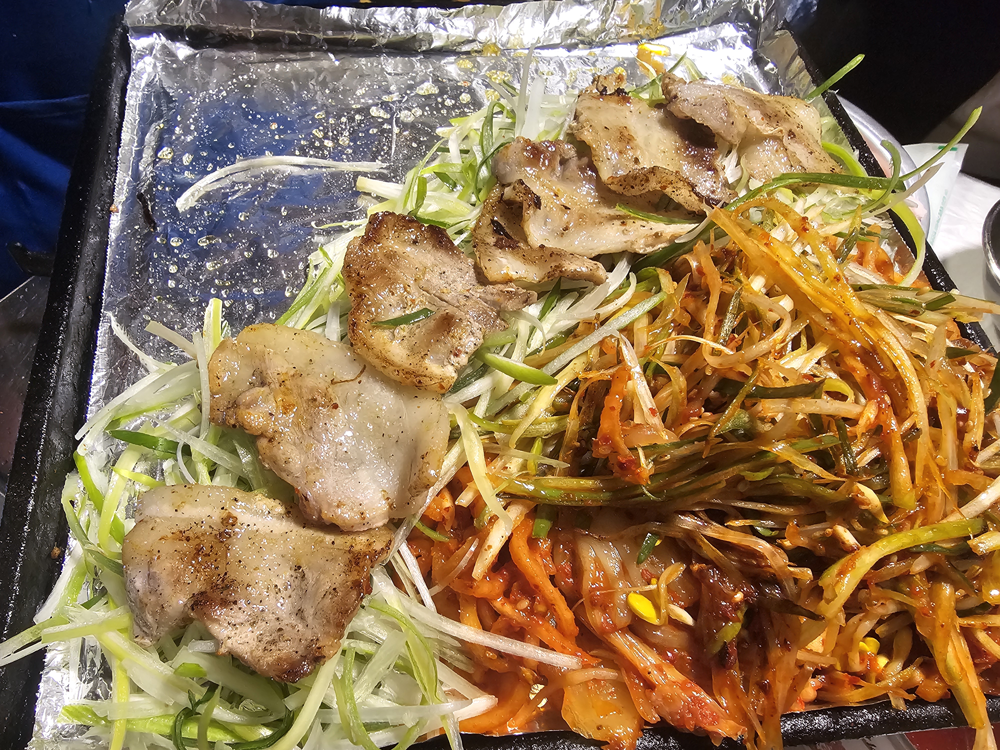 불판 위에서 지글지글 구워지는 냉삼, 거기에 파절이 + 콩나물 + 무생채까지 올려 함께 구우면 끝장나는 맛이 탄생한다!