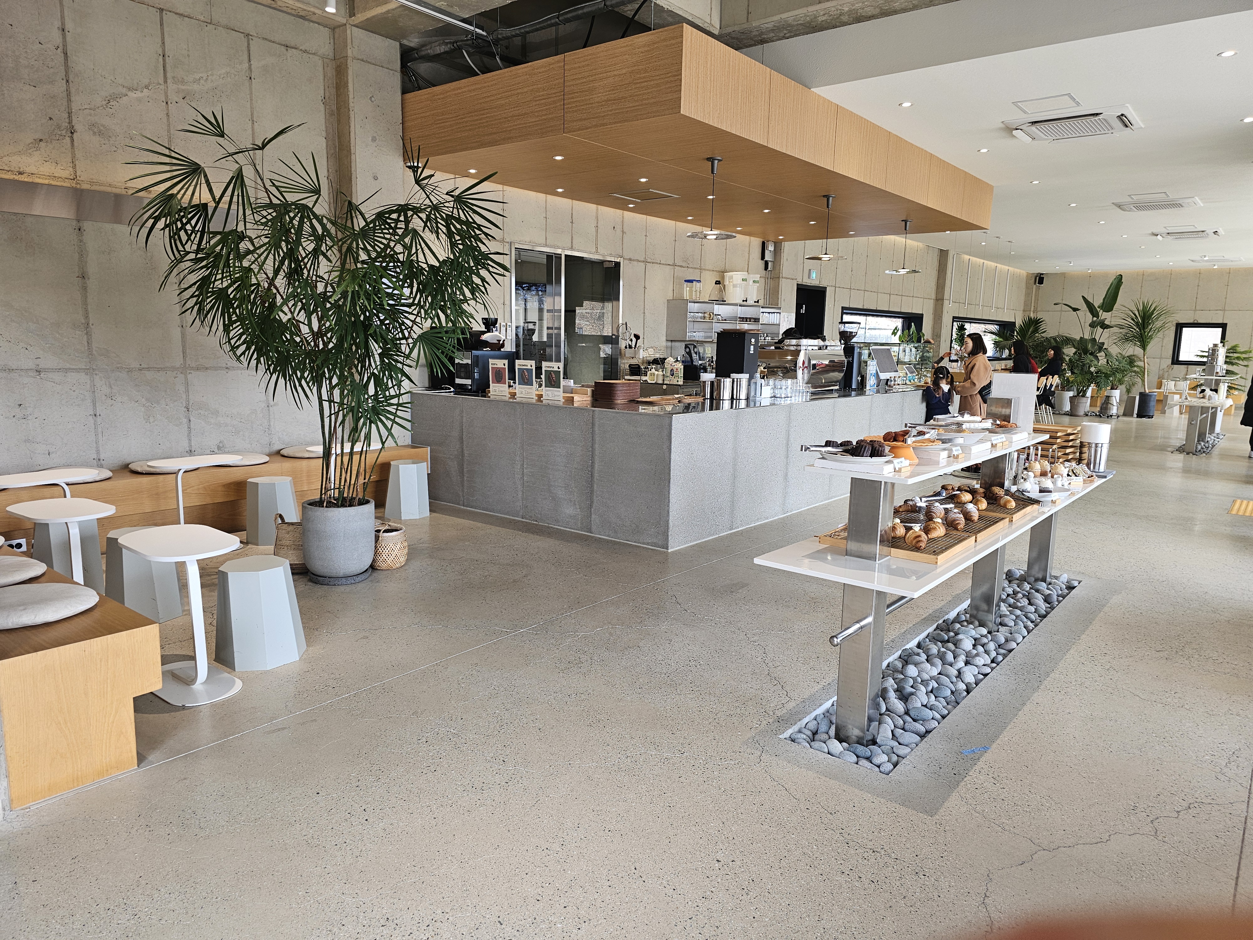 내부로 들어서자 모던하면서도 따뜻한 분위기의 공간이 펼쳐졌어요. 높은 천장과 콘크리트 벽, 그리고 감각적인 원목 가구들이 조화를 이루며 감성적인 분위기를 자아냈어요. 무엇보다 좌석 간 간격이 넓어서 혼자 와도, 친구들과 와도 편하게 즐길 수 있는 공간이었어요.